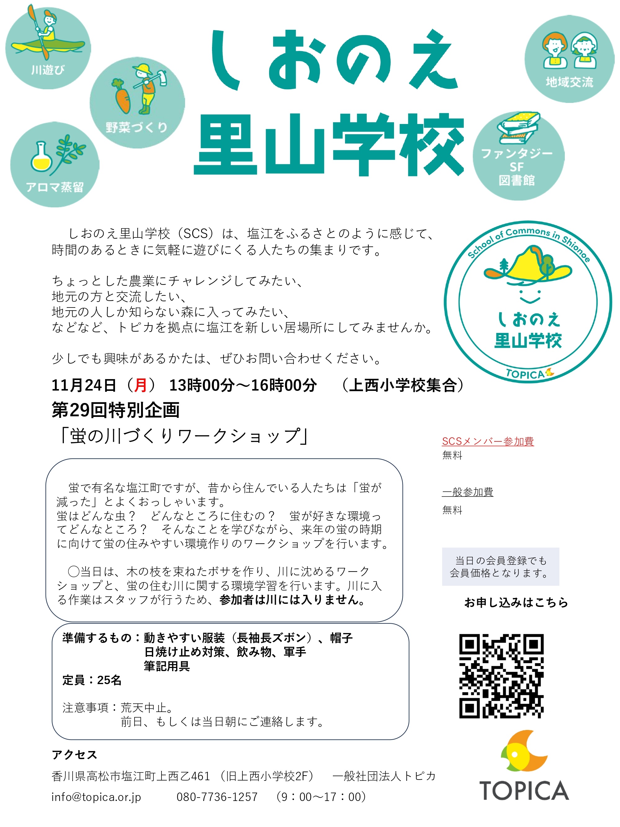 蛍の住む川作り・環境学習会 2025年10月20日 | 体験 「蛍の住む川作り・環境学習会」を実施します。 蛍がいる風景を後世に伝えるために、蛍という昆虫に関する理解を深め、蛍が住みやすい川にするために川の中の有機物を増やすシロを作る実験などを行います。 お申し込みはこちらから facebook twitter line